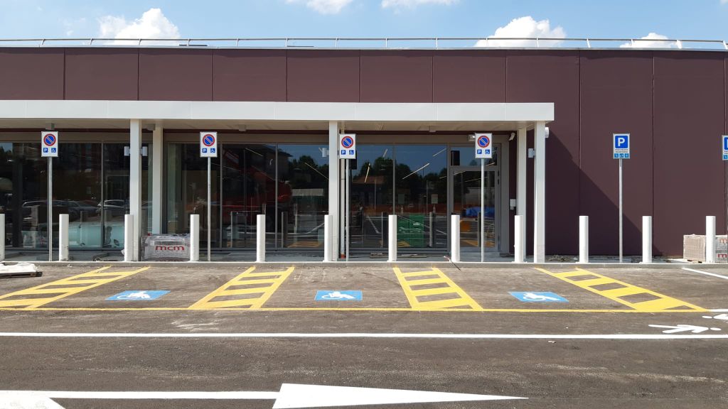 Una grande vetrata dà sull’area parcheggio per rendere visibile l'esterno e le casse sono spostate verso il lato ingresso.