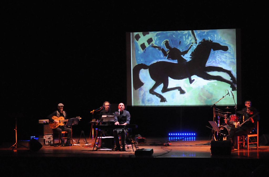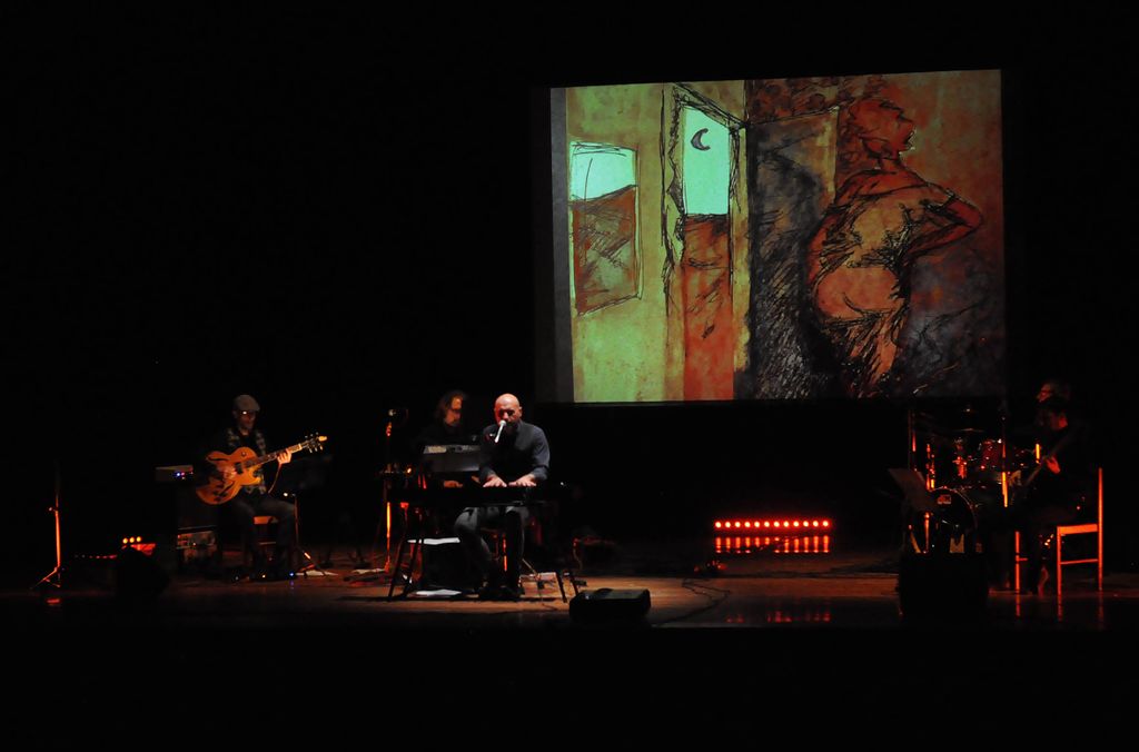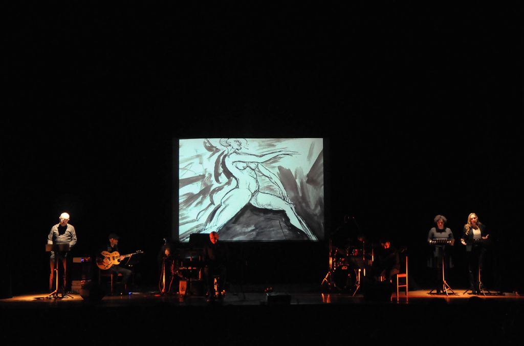 Le voci si impastano, l’immaginazione viene stimolata dalla proiezione delle tavole di Conte, artista della voce e della mano, in una serata per stare insieme in un teatro ritrovato, casa della poesia, della musica e del divertimento.