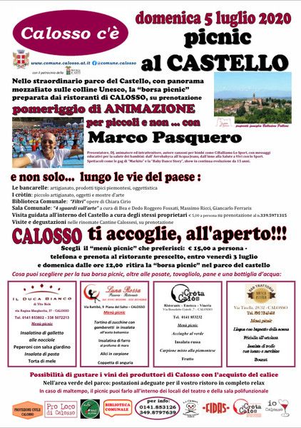 Anche Calosso riparte dopo mesi di lockdown legati al Covid19. Domenica pic nic al Castello. Ai partecipanti verrà consegnata una speciale borsa pic nic, realizzata dai ristoratori locali. Pomeriggio di animazione con Marco Pasquero. Per le vie del paese bancarelle, visite guidate e molto altro. Ulteriori dettagli QUI.