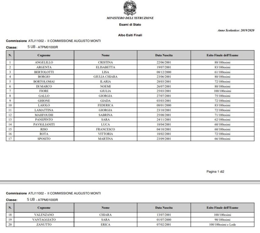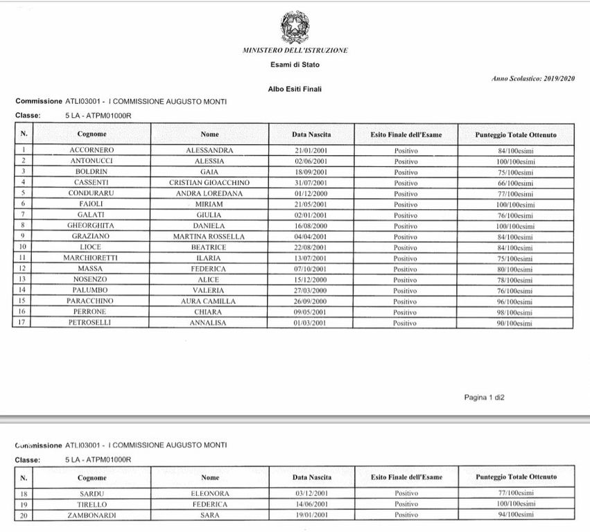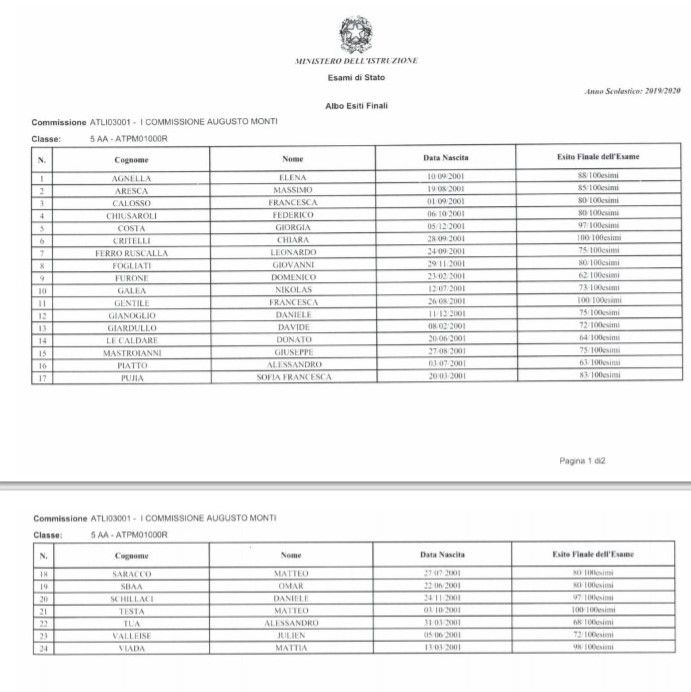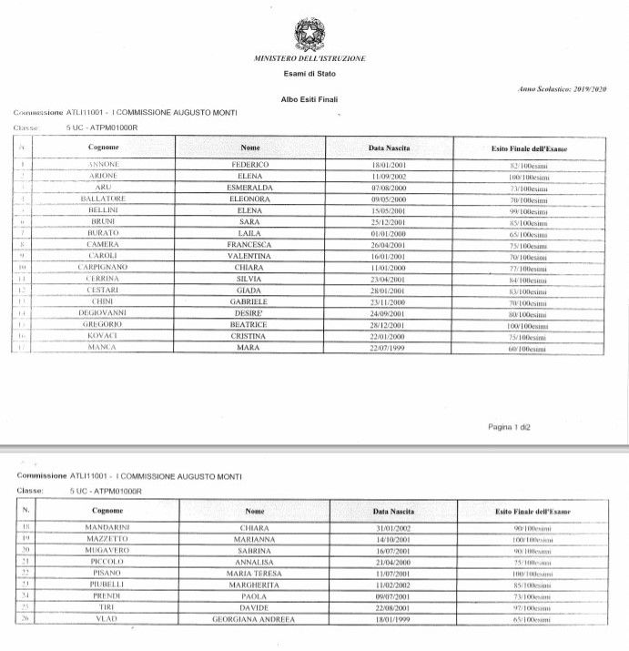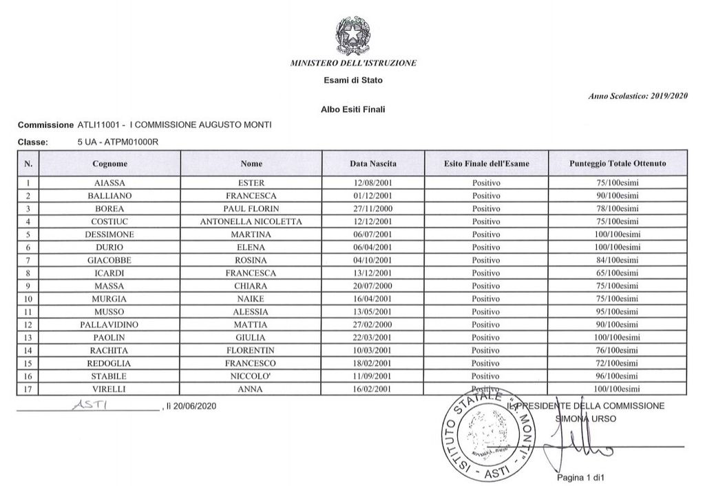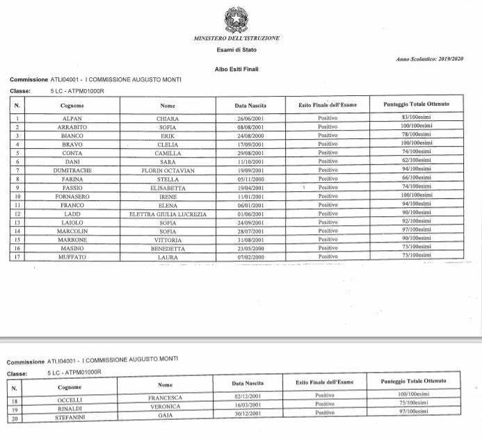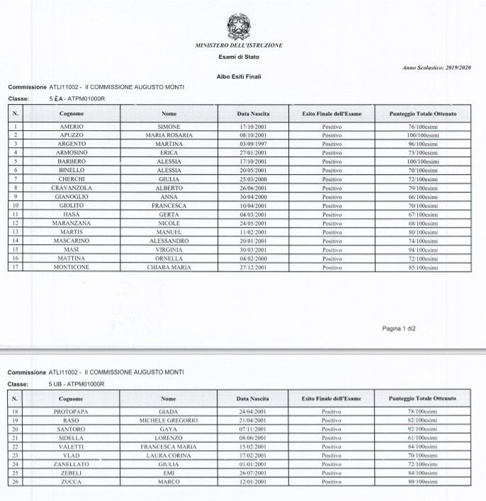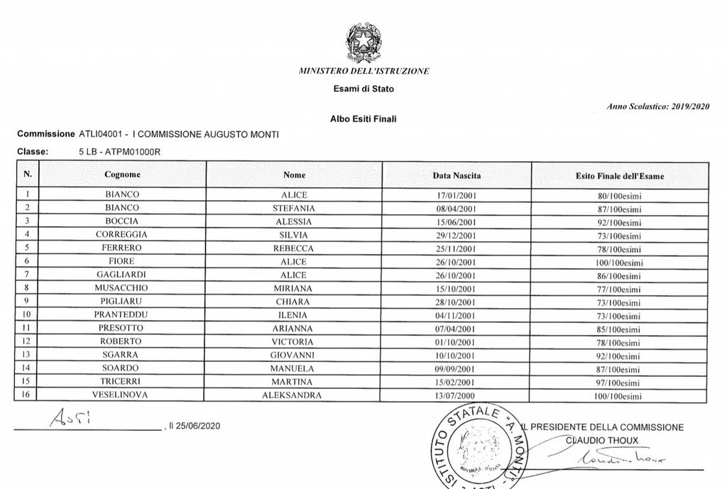 Sul sito internet dell’Istituto Augusto Monti sono stati pubblicati i tabelloni con gli esiti degli esami di Maturità sostenuti dagli allievi e dalle allieve delle otto quinte. I cento centesimi sono ben ventiquattro (comprendendo anche il 100/100esimi con lode a Erica Zanutto).