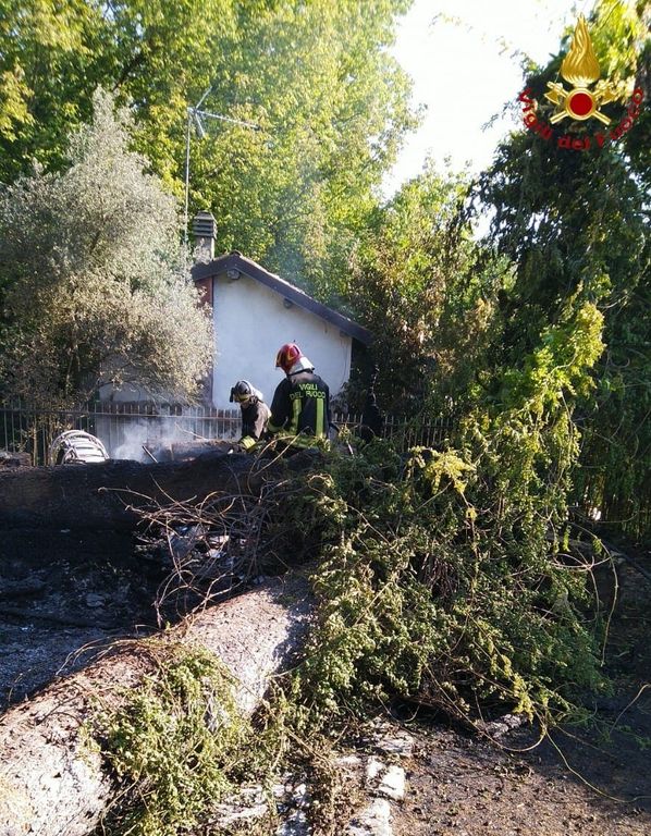 Le fiamme, divampate in un capanno agricolo, si sono estese a una legnaia e a un albero alto oltre 20 metri