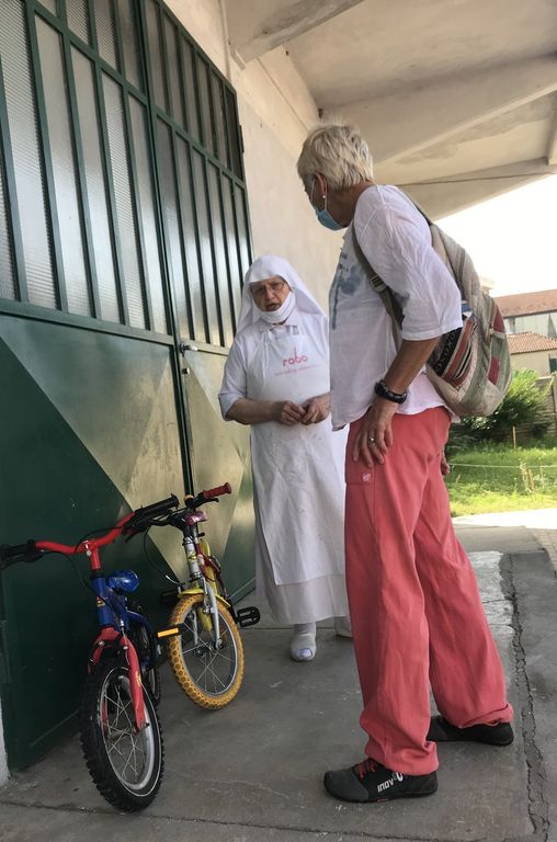 Nelle foto con Elena Dugono e Suor Luigina Alcuni bimbi provano le biciclette prima di portarle a casa.