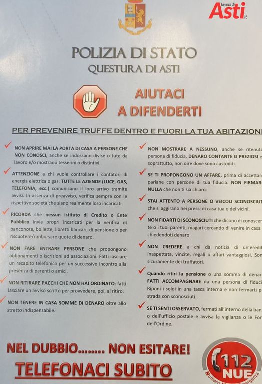 "Aiutaci a difenderti... non sei solo". La nuova campagna di prevenzione truffe agli anziani della Questura di Asti