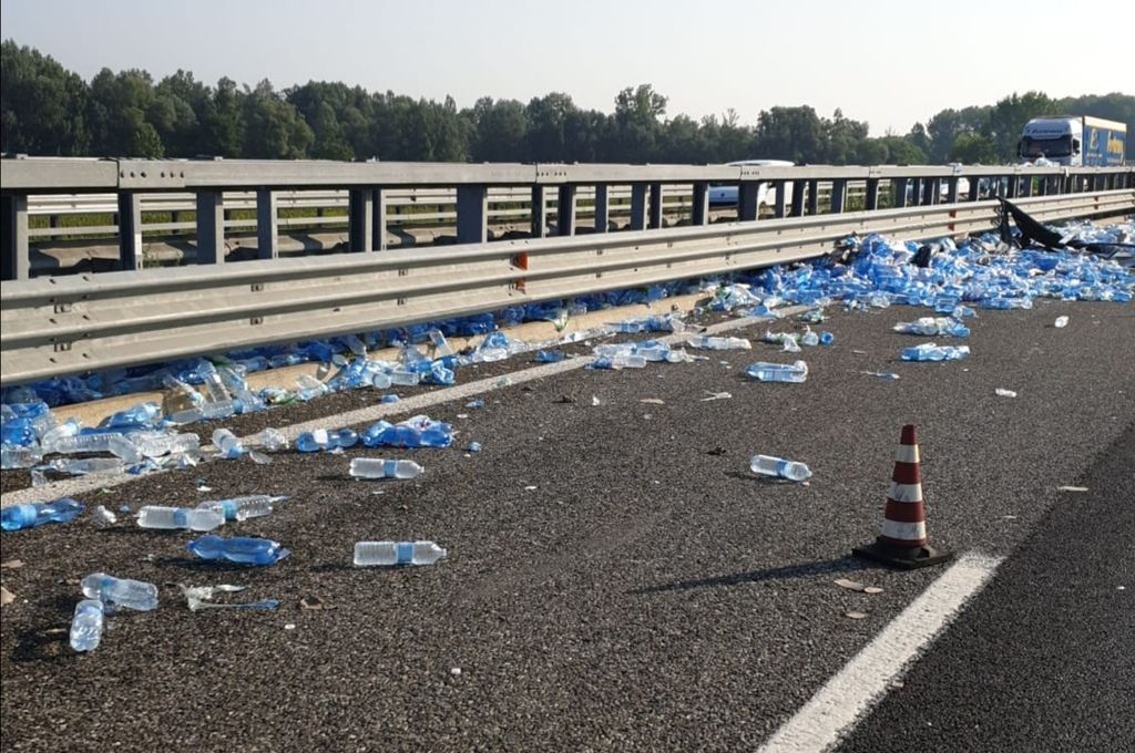 Code e rallentamenti sulla A33 per un bilico che ha perso l'intero carico di acqua che trasportava