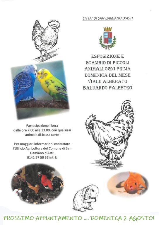 Domenica 2 agosto, rRitorna anche il mercatino dei piccoli animali, dalle 7 alle 13 la partecipazione è libera con qualsiasi animale di bassa corte, in viale alberato Baluardo Palestro.