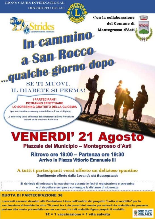 Sarà recuperato venerdì 21 agosto, l'evento "In cammino a San Rocco", organizzato dal Lions club Storici, Artisti e Presepisti d’Asti, annullato domenica scorsa a causa del maltempo.