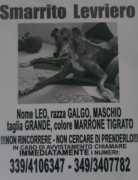 È scomparso da ieri mattina da corso Felice Cavallotti ad Asti Leo, levriero galgo marrone tigrato di taglia grande.