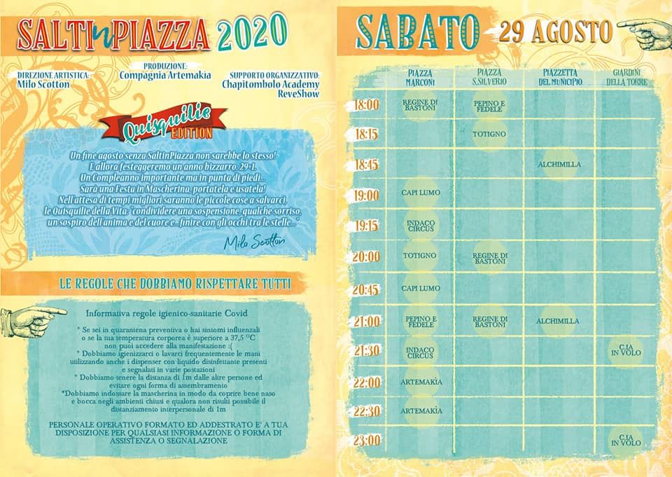 "Un fine agosto senza SaltinPiazza non sarebbe lo stesso. E allora festeggeremo un compleanno (29 più uno) in punta di piedi, in attesa di tempi migliori. Saranno le piccole cose a salvarci, le Quisquilie della Vita", spiega sui social il direttore artistico, Milo Scotton.