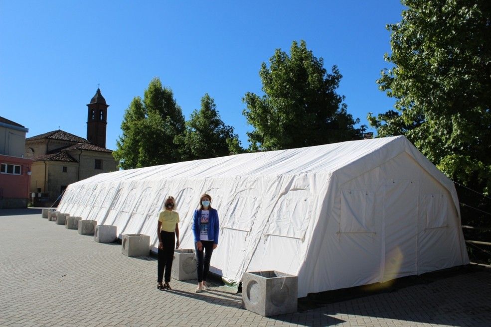 Anche a Villafranca ci si prepara alla riapertura delle scuole, il Comune ha allestito nel cortile dell'Istituto Comprensivo, in piazza Goria, due tende modulari da 72 metri quadrati ognuna, tra loro comunicanti, adibite a mensa.