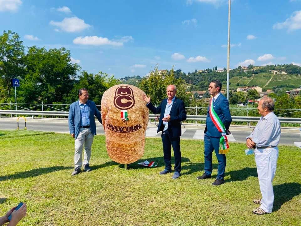 Ieri a Canelli è stata inaugurata la bottiglia gigante posizionata sul Cavalcavia Goria fornita dalle Cantine Gancia, storica azienda canellese che creò nel 1865 il primo spumante italiano.