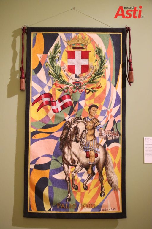 Il laboratorio di Asti ha realizzato inoltre anche gonfaloni e di questi sono presenti in mostra lo stendardo dellaProvincia di Asti(2002) e il bellissimoPalioprogettato da Ugo Scassa e vinto nel 2010 dal Borgo Tanaro Trincere e Torrazzo. Entrambi i gonfaloni sono caratterizzati da richiami alla grande pittura: dalle figure eseguite tra Quattro e Cinquecento dall’astigiano Gandolfino da Roreto, alla celebre tela di Giorgio De Chirico con il cavallo Arione, immortale e divino.