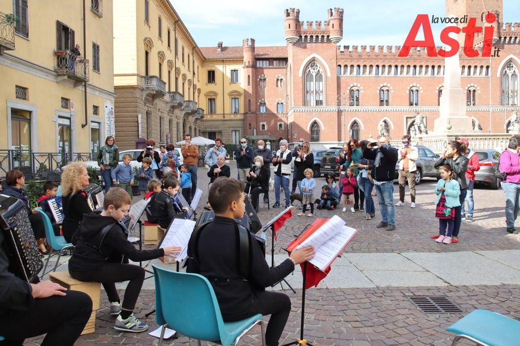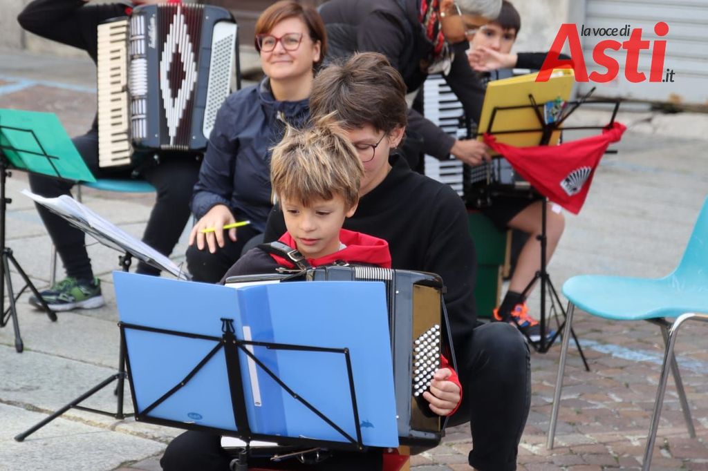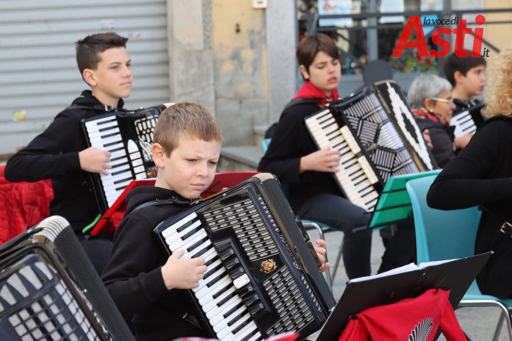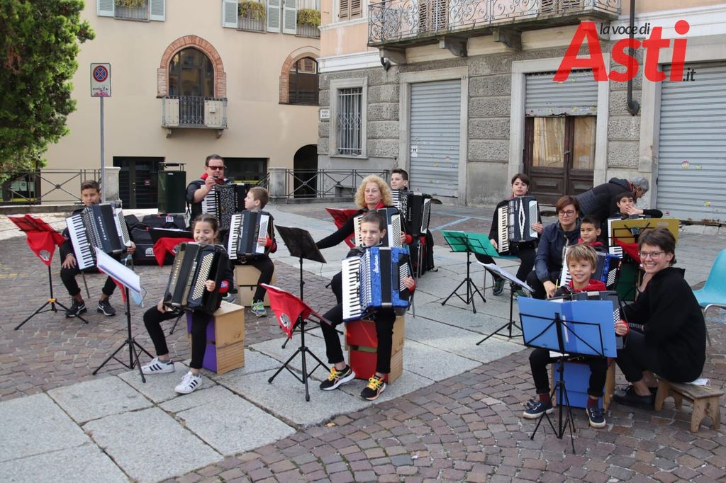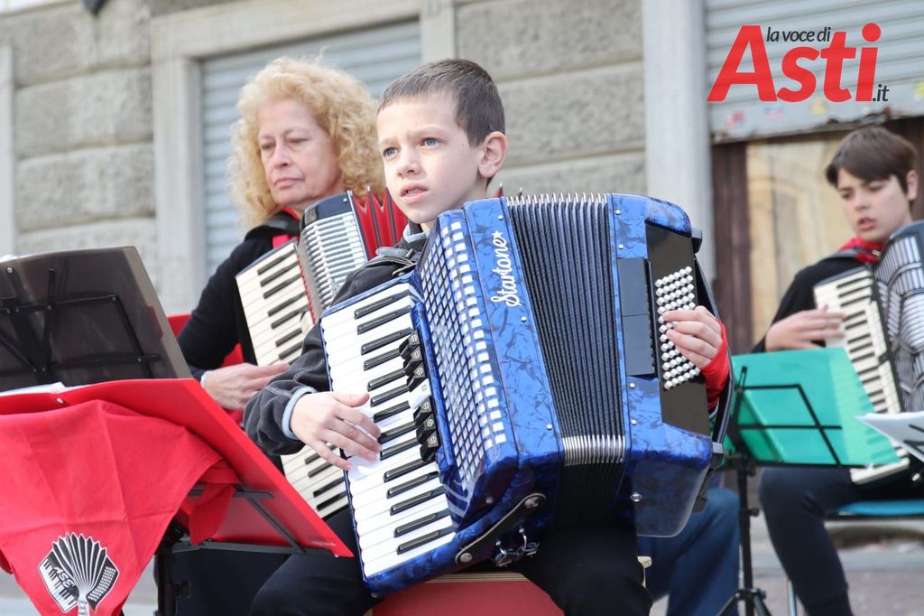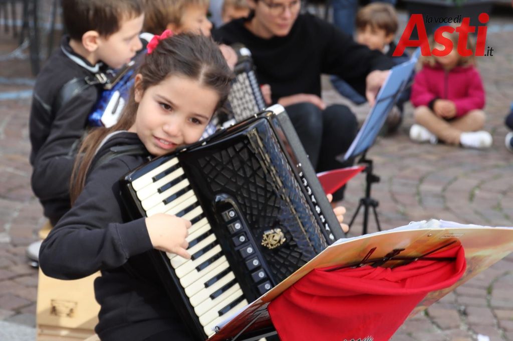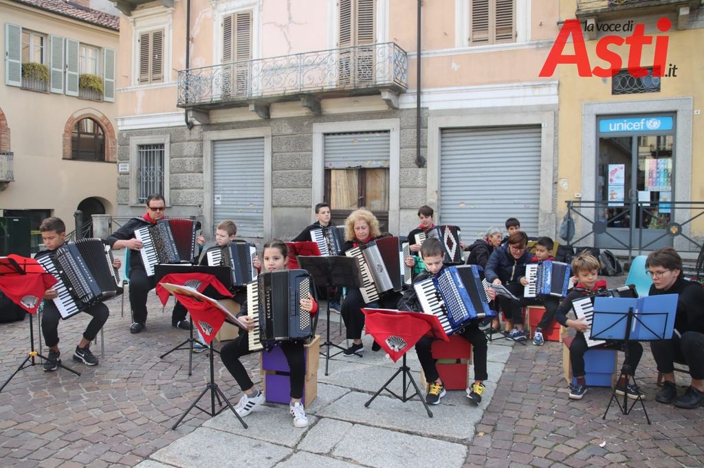 È stato un momento suggestivo ed emozionante il concerto dei bambini della banda ASE' (Accordion Suzuki Ensemble) dell'Associazione culturale Suzuki di Asti in piazza Roma che, alle 11, ha dato prova di bravura e passioni con i piccoli che seguono il metodo Suzuki, rivolto ai bambini in età prescolare che offre l'opportunità di sviluppare abilità, talento e attitudini insieme ai genitori, veri maestri dei propri figli.
