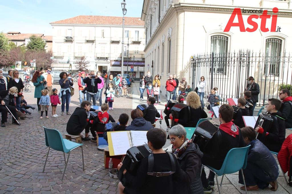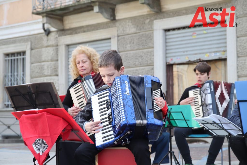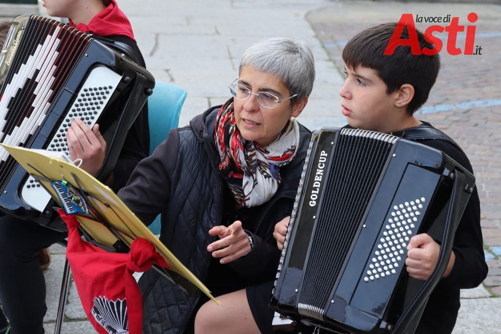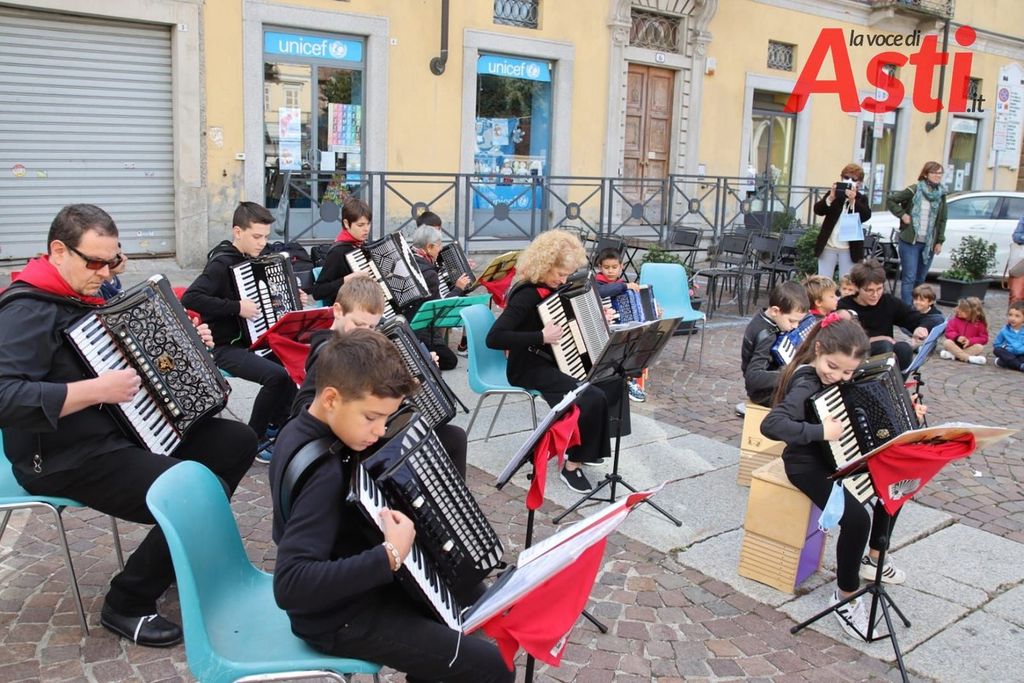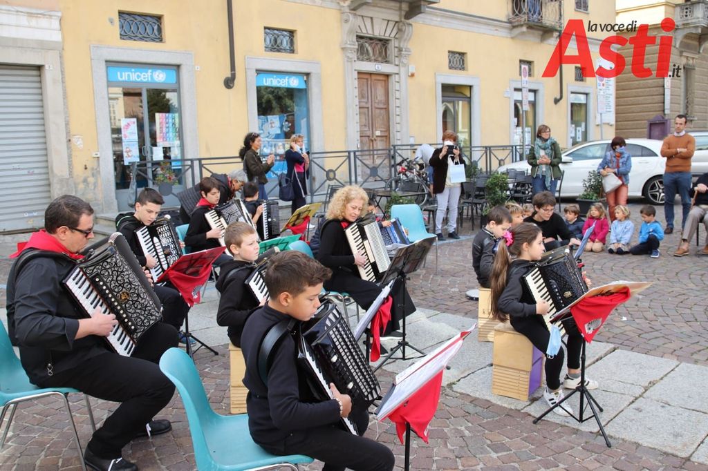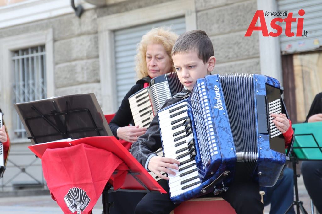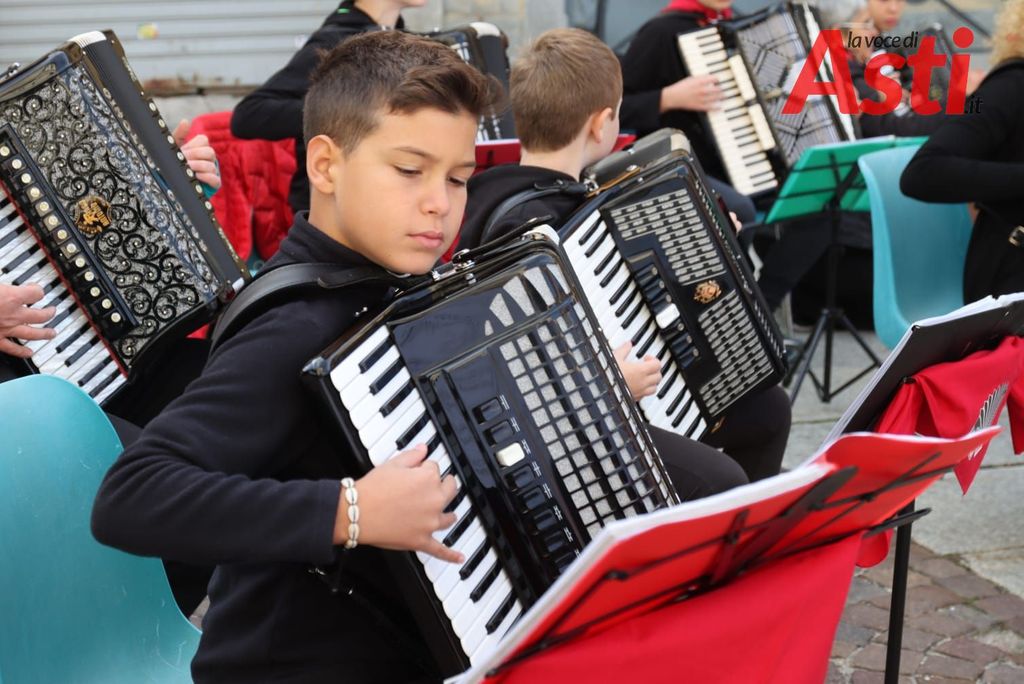 È stato un momento suggestivo ed emozionante il concerto dei bambini della banda ASE' (Accordion Suzuki Ensemble) dell'Associazione culturale Suzuki di Asti in piazza Roma che, alle 11, ha dato prova di bravura e passioni con i piccoli che seguono il metodo Suzuki, rivolto ai bambini in età prescolare che offre l'opportunità di sviluppare abilità, talento e attitudini insieme ai genitori, veri maestri dei propri figli.