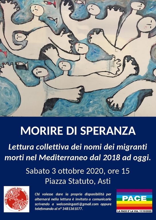 La Rete Welcoming Asti e il Cantiere astigiano per la Pace “La Pace è la Via”, in occasione della “Giornata nazionale in memoria delle vittime dell'immigrazione”, organizzano una lettura collettiva a staffetta aperta alla cittadinanza di una parte (dal 2018 ad oggi) della lista delle persone migranti morte nel tentativo di raggiungere l’Europa.