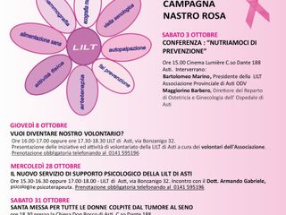 - Le volontarie dell’Associazione organizzano un incontro giovedì 8 ottobre, dedicato ad aspiranti nuovi volontari, in cui presenteranno le iniziative e le attività della LILT di Asti (ore 16-17 oppure ore 17.30-18.30 presso la sede LILT di via Bonzanigo 32A. Prenotazione telefonica obbligatoria).