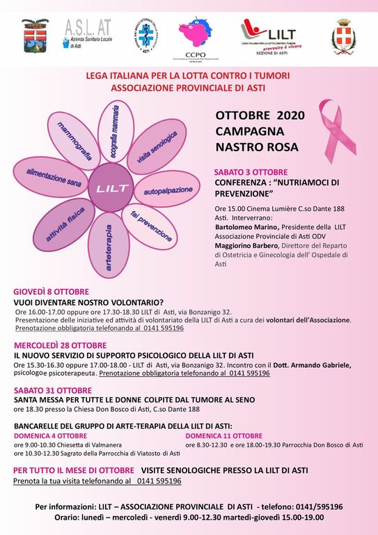 Va infine doverosamente ricordato che, grazie alla Campagna “Nastro Rosa della LILT”, per tutto il mese di ottobre, sarà possibile sottoporsi a visite senologiche gratuite presso la sede LILT di Asti in via Bonzanigo 32A, previa prenotazione telefonica alla segreteria LILT: 0141/595196.