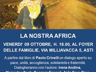 A partire dal libro di Paolo Crivelli “La nostra Africa. Un cammino interculturale verso la reciprocità”, si svolgerà un momento d’incontro e di dialogo aperto su pace, unità, accoglienza, solidarietà e fraternità. Dialogheranno con l’autore Paolo Crivelli: Irene Andina, Mamadou Seck, Ousman Fanneh, Aida Faye Diop. Moderatore: Domenico Massano.