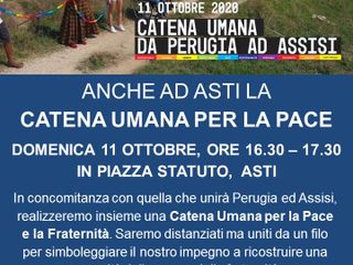 Domenica 11 ottobre, una grande catena umana unirà Perugia ad Assisi nel giorno in cui si sarebbe dovuta svolgere la Marcia della Pace. In concomitanza con quella che unirà Perugia ad Assisi, la Rete Welcoming Asti e il Cantiere astigiano per la Pace “La Pace è la Via” invitano tutti a realizzare insieme anche ad Asti una Catena Umana per la Pace e la Fraternità.