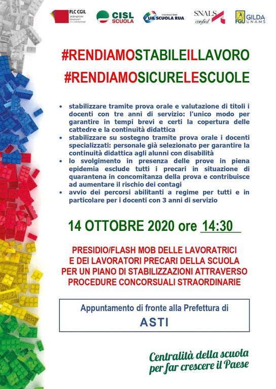 FLC Cisl, Cisl Scuola, Uil Scuola Rua, Snals Confsal e Gilda Unams organizzano, per le 14.30 di mercoledì 14 ottobre, un presidio/flash mob di lavoratrici e lavoratori precari della scuola di fronte alla Prefettura di Asti.