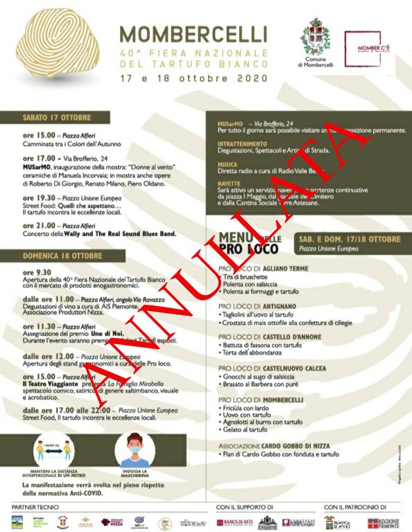 Ritenendo non sussistano le condizioni necessarie “per garantire uno svolgimento in totale sicurezza mantenendo vivo lo spirito che da sempre contraddistingue questi giorni di festa, all'insegna della condivisione e dell'allegria”, gli organizzatori della Fiera del Tartufo di Mombercelli, in programma nel fine settimana, ne hanno annunciato l’annullamento per tramite di un post pubblicato sulla pagina Facebook del Comune.