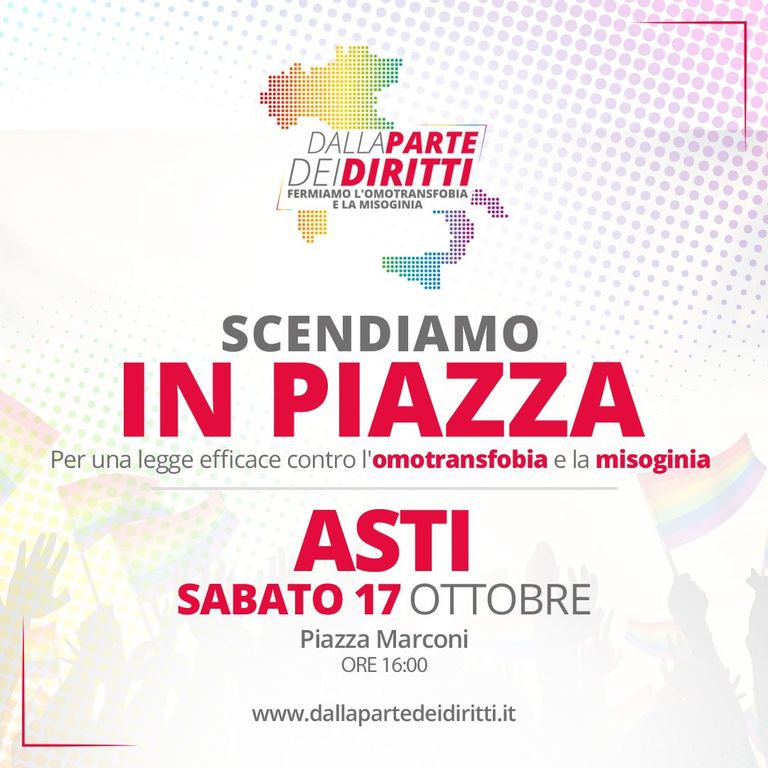 Nei giorni in cui (dal 20 ottobre), il Parlamento sarà impegnato nella discussione della proposta di legge control’omotransfobia e la misoginia, anche ad Asti si porta il messaggio contro la violenza.