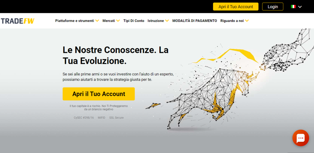 Uno dei broker che attirerà la vostra attenzione quando inizierete la ricerca è TradeFW. A differenza di molti broker sul mercato, questo è regolato dalla Securities and Exchange Commission di Cipro (CySEC). È stata istituita nel maggio 2018 da iTrade Global (Cy) Ltd, che ha sede a Limassol, Cipro. Non molti broker che troverete sono regolati, TradeFW è autorizzata a fornirne i relativi servizi. Si tratta di un broker di forex e CFD che offre tante opportunità da esplorare. Il sito di TradeFW è disponibile in più lingue, tra cui inglese, italiano, spagnolo, tedesco, russo e olandese.