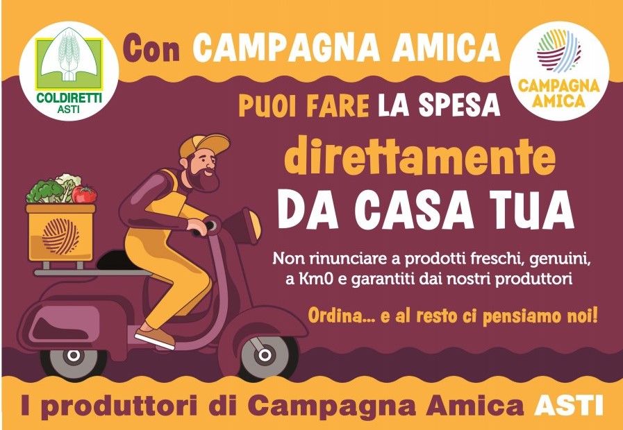 Come già avvenuto nel corso del lockdown primaverile, le aziende agricole astigiane che aderiscono a “Campagna Amica” di Coldiretti mettono a disposizione dei consumatori i loro prodotti con consegne a domicilio. Pertanto si può ricevere direttamente a casa dalla carne ai salumi, dagli ortaggi alla frutta, dai formaggi alla pasta, dal pane al miele, dal vino alle confetture, dalle uova alle nocciole, dai succhi di frutta alle farine, fino allo zafferano: un paniere completo e a chilometri zero. Ogni azienda aderente alla campagna, di respiro nazionale, consegna la spesa al domicilio mediamente nel raggio di una trentina di chilometri e comunque tutti servono il capoluogo e i maggiori centri della provincia. Alcune aziende agricole sono in grado di integrare la loro offerta con le altre aziende di prossimità.