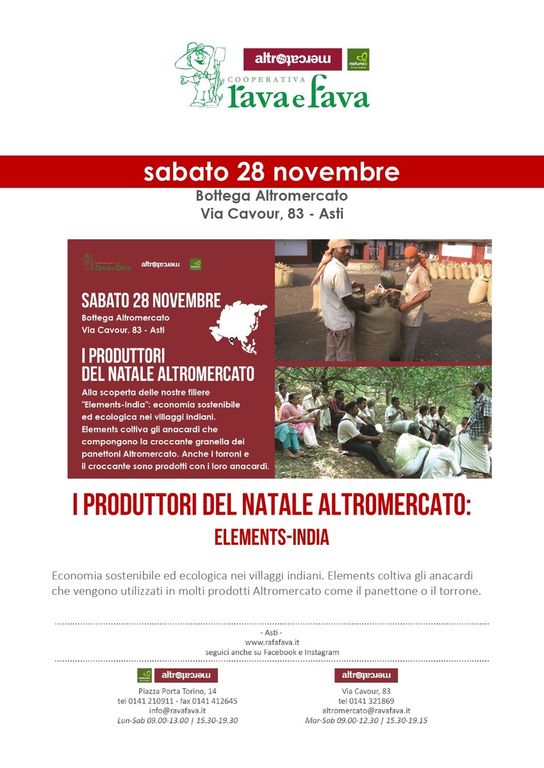 Sabato 28 novembre alla Bottega Rava e Fava di via Cavour 83 in Asti sarà organizzata una giornata dedicata ad ELEMENTS, organizzazione dello Stato del Kerala impegnata per sviluppare nei villaggi indiani un'economia sostenibile ed ecologica. Raggruppa 4500 contadini nella biosfera dei monti Nilgiri, una delle aree più importanti per la biodiversità a livello planetario, impegnati concretamente a preservare e valorizzare le risorse locali in un contesto di forte povertà e di distruzione ambientale. L'agricoltura condotta su piccoli appezzamenti e di metodo biologico e tra le diverse produzioni ci sono gli anacardi che macinati in granella sono ingredienti dei panettoni e dei torroni Altromercato.