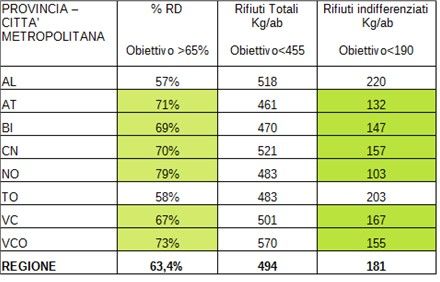 Per quanto riguarda la percentuale di raccolta differenziata nei capoluoghi di provincia, in testa alla classifica Verbania (81,8%), seguita da Biella (78,5%) e Novara (73,9%). Chiudono la classifica Alessandria (48,5%) e Torino (47,7%)