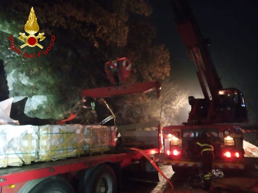 Camion carico di lastre, esce di strada. Necessario l'intervento dell'autogru dei Vigili del Fuoco