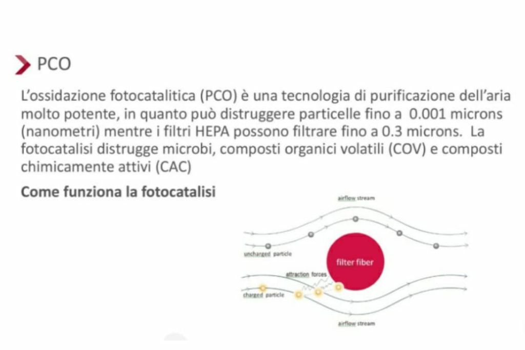L’azione della fotocalisi (PCO), per effetto della luce LED UV.A e del catalizzatore in Diossido di Titanio, genera decomposizione dei gas e dei microrganismi all'interno dell'apparecchio nel quale si realizza una degradazione dei batteri ed una disattivazione dei virus con emissione contemporanea di elementi sanificanti restituiti con l'aria immessa in ambiente.