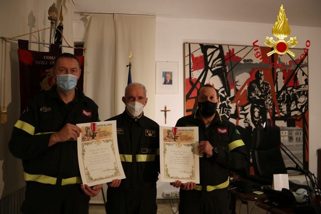 Oggi, il comandante dei Vigili del Fuoco di Asti, Ferdinando Franco, ha consegnato a tre nuovi pensionati capi reparto Achille Pomo, Giuseppe Palumbo e Gerardo Marzano i "picozzini" da pensionato, solitamente consegnati durante i festeggiamenti di Santa Barbara, ma che, causa pandemia, non è stato possibile.