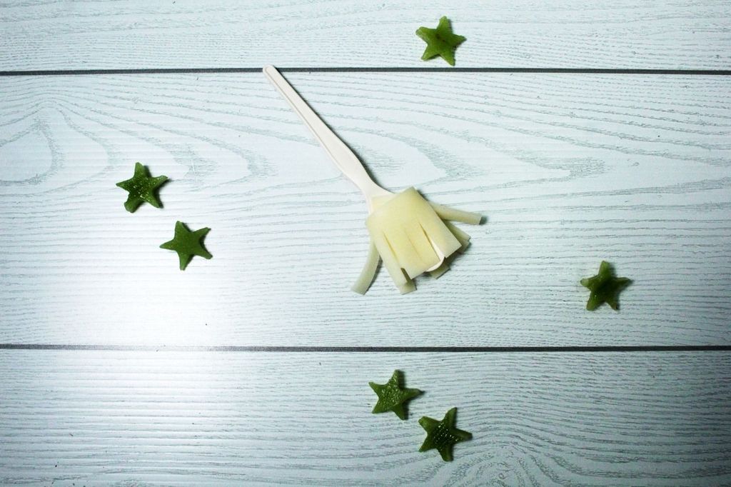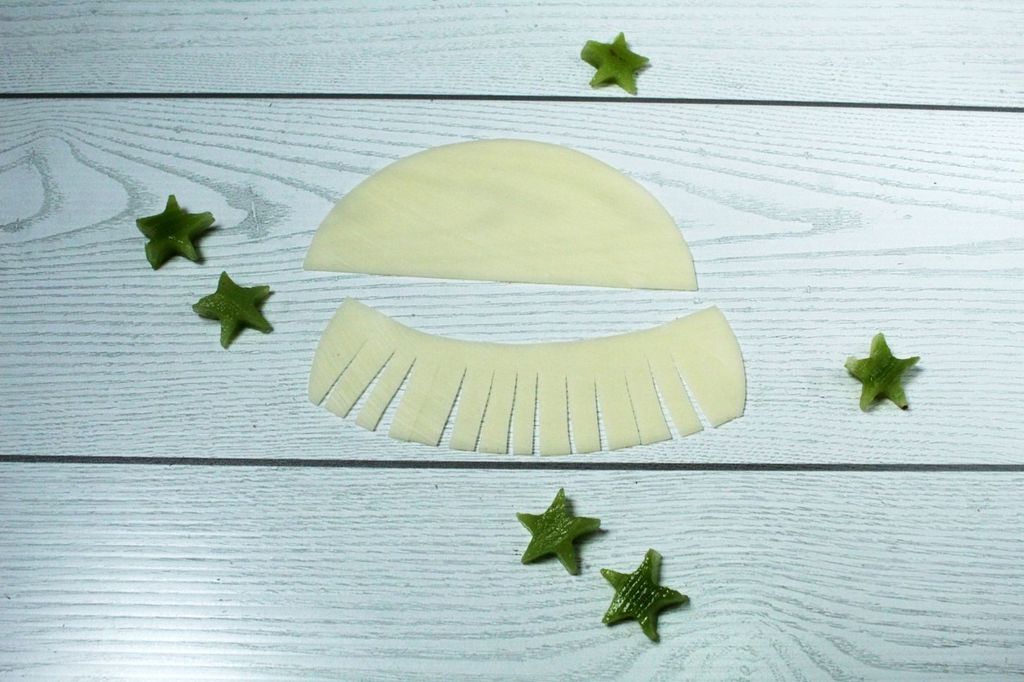 Modellate ogni cucchiaino a forma di scopa (per scacciare le preoccupazioni!) tagliando a metà le fette di formaggio, quindi formando delle frange sottili per ogni metà fetta