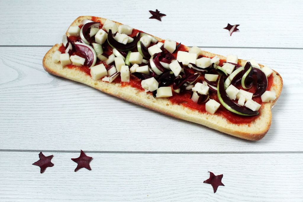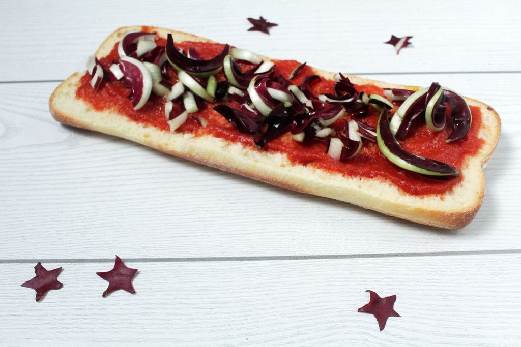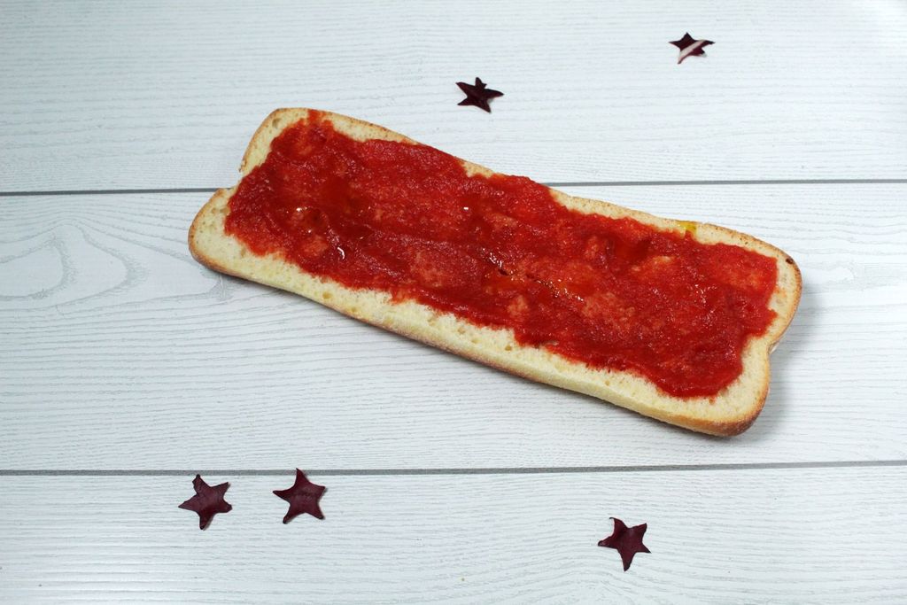 Tagliate a metà le 2 ciabatte di pane per ottenere 4 basi per pizza