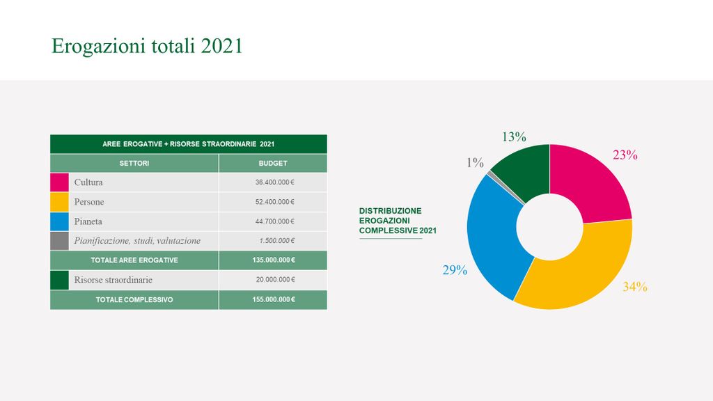 Per quanto riguarda invece i prossimi dodici mesi, più nel dettaglio, Compagnia di San Paolo ha stanziato un totale di 155 milioni di euro. In dettaglio, 36,4 per la Cultura, 52,4 per le Persone (welfare e non solo), 44,7 per il Pianeta (green e sostenibilità) e altri 21,5 tra progettazione e risorse straordinarie.