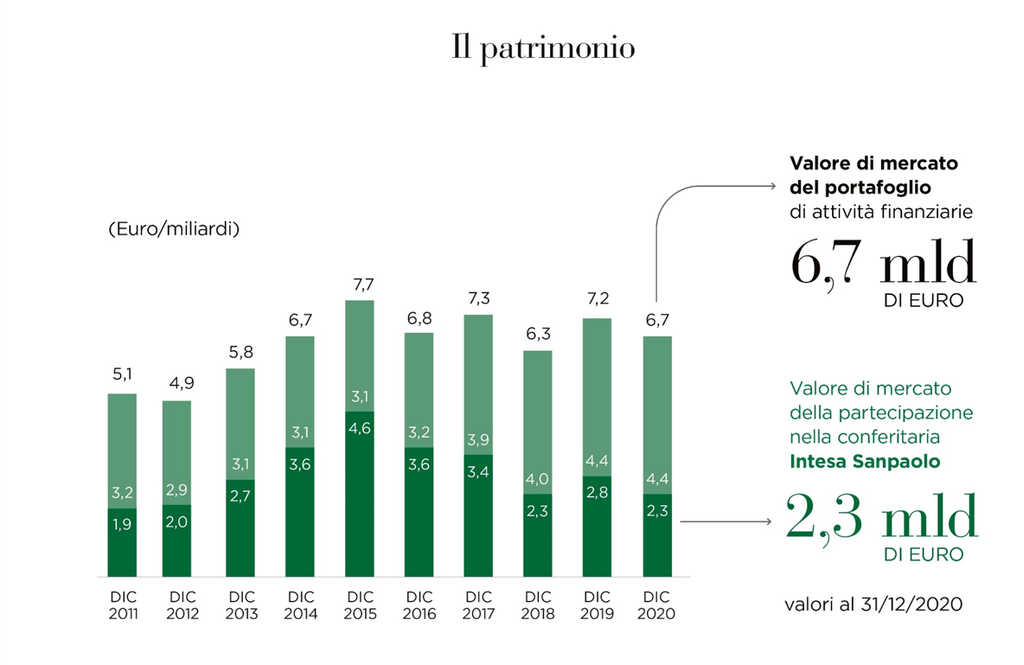 Di questo patrimonio, 2,3 miliardi di euro derivano dal valore di mercato della partecipazione in Intesa Sanpaolo, banca di cui la Compagnia detiene la quota azionaria di riferimento, essendone il primo azionista.