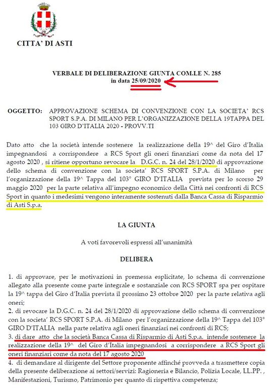 Il sig. Galvagno è divenuto “banchiere” ad aprile 2020 e la Banca entra ufficialmente in gioco in data successiva con la Delibera di Giunta N. 285 del 25/09/2020 nella quale delibera si cita addirittura la Nota di agosto 2020 con la quale la Banca stessa comunica l’intenzione di accollarsi integralmente le spese. Testualmente si legge: “la società Banca Cassa di Risparmio di Asti S.p.a. intende sostenere la realizzazione della 19^ del Giro d’Italia impegnandosi a corrispondere a RCS Sport gli oneri finanziari come da nota del 17 agosto 2020”. Quindi il Sindaco quando afferma il contrario o non è informato delle sue stesse delibere e della corrispondenza intercorsa oppure anche qui mente.