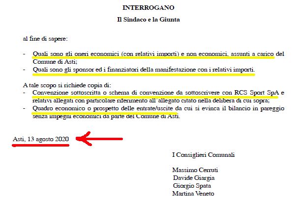 Parallelamente a quella relativa la richiesta di decadenza dal ruolo della consigliera Martina Veneto (CLICCA QUI per rileggere l’articolo), l’altro tema sul quale si stanno aspramente confrontando l’Amministrazione comunale e il Movimento 5 Stelle è quello inerente i costi della tappa astigiana del Giro d’Italia 2020.