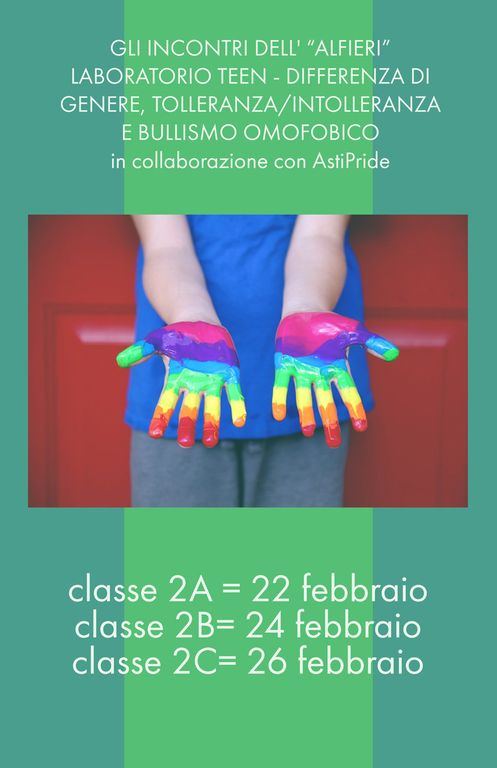 Nella settimana dal 22 al 26 febbraio, le classi seconde dell’Istituto saranno coinvolte in un progetto, in collaborazione con Agedo e AstiPride, sulle diversità di genere, sui meccanismi di tolleranza e intolleranza e il bullismo omobitransfobico: si svolgerà in ogni classe infatti un laboratorio linguistico sulle tematiche evidenziate, e una riflessione sui meccanismi con cui si esprime tramite le parole l’integrazione o l’intolleranza.