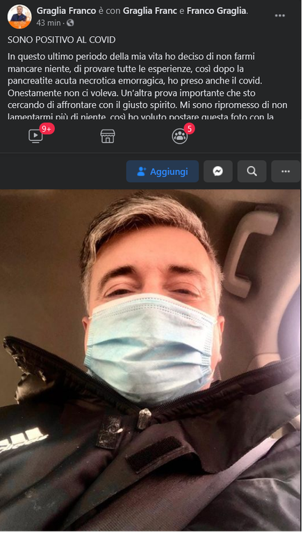 Ora, il Covid: “In questo ultimo periodo della mia vita ho deciso di non farmi mancare niente, di provare tutte le esperienze, così dopo la pancreatite acuta necrotica emorragica, ho preso anche il Covid” scrive il vicepresidente del Consiglio regionale.