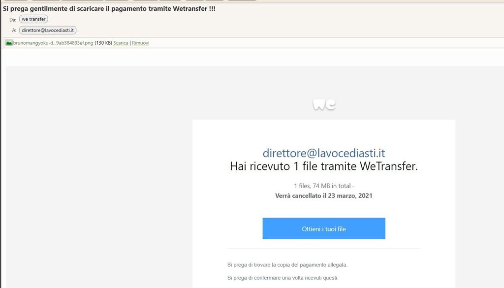 ‘Scarica il pagamento’ tramite We Transfer, ma in realtà è un (ennesimo) tentativo di truffa