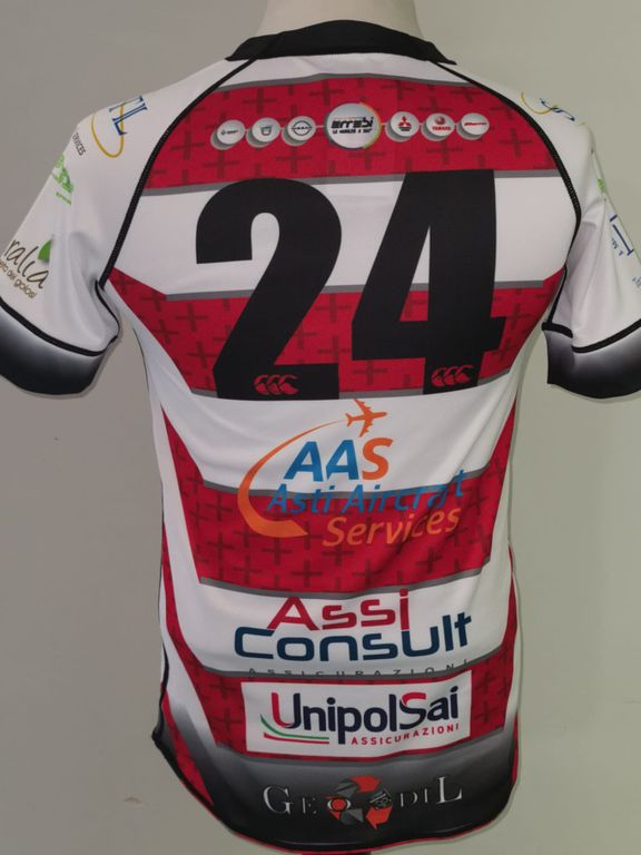 La Monferrato Home Pro Jersey è un mix di tradizione, tecnologia e qualità: innanzitutto vi è un chiaro ritorno al passato con il rigato bianco e rosso, colori che identificano quelli della città di Asti, il tocco di grigio e la croce di San Giorgio in tonalità rosso scuro sulle bande rosse richiamano il concetto di franchigia come punto di riferimento del basso Piemonte.