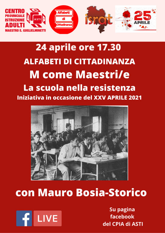 Sabato 24 aprile alle 17.30 il Cpia di ASTI, l'Istituto Statale di Istruzione degli Adulti, in collaborazione con l’Israt, organizza la diretta Streaming Ospite della serata sarà lo storico Mauro Bosia.