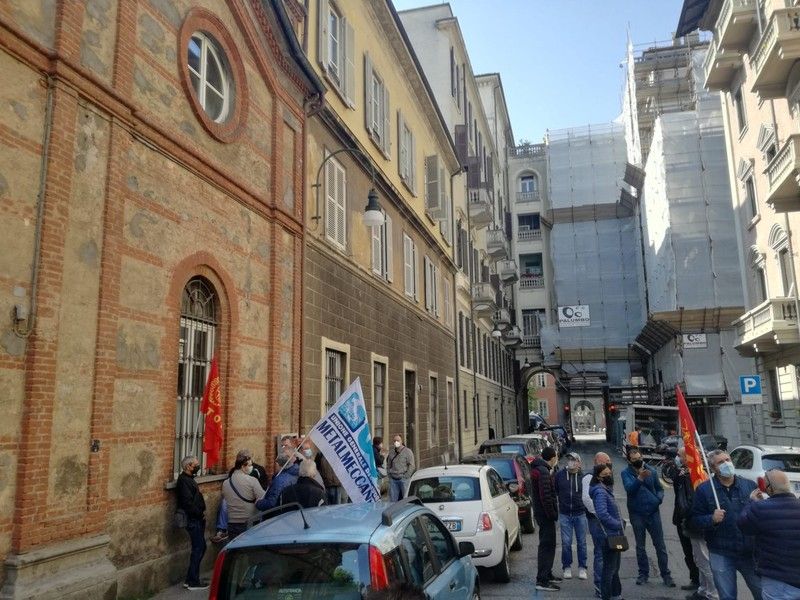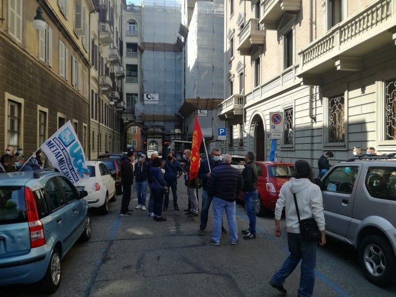 Questa mattina via Perrone, nel breve tratto tra via Bertola e via Cernaia, è un'area blindata: chiusa dai due lati, dalle forze dell'ordine. Nel mezzo, sotto le finestre dello studio della curatela fallimentare, decine degli operai ex Embraco che vedono avvicinarsi (il 25 aprile) la fine più triste di una vicenda che ormai lo vede coinvolti da oltre tre anni e mezzo.