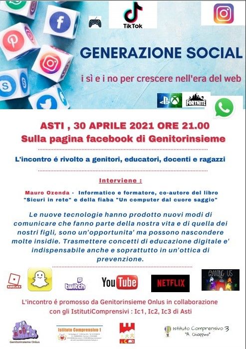 La prima tappa del progetto prevede un incontro di approfondimento con un esperto, in programma il 30 aprile alle 21, che potrà venire seguito liberamente collegandosi alla pagina Facebook dell’associazione. Si parlerà di strumenti digitali, età di utilizzo di social e giochi, tempo di utilizzo, dipendenze, pericoli, responsabilità dei genitori, consigli su come accompagnare i propri figli in questo percorso per un utilizzo consapevole e sano.