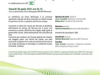 L’apertura dei lavori – che si svolgeranno in live streaming sulla piattaforma Zoom e potranno venir seguiti sulla pagina Facebook MFE Piemonte – sarà affidata a Luisa Trumellini (Segretaria nazionale del Movimento) e Matteo Gori (presidente nazionale GFE). Seguirà una relazione a cura del senatore Tommaso Nannicini con interventi dei partecipanti e conclusioni affidate a Stefano Moscarelli (Segretario MFE Piemonte).