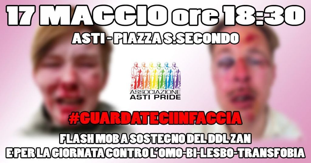 Asti Pride organizza "Guardateci in faccia", flash mob a sostegno del DDL Zan e per la Giornata Internazionale contro l’omo-lesbo-bi-transfobia.