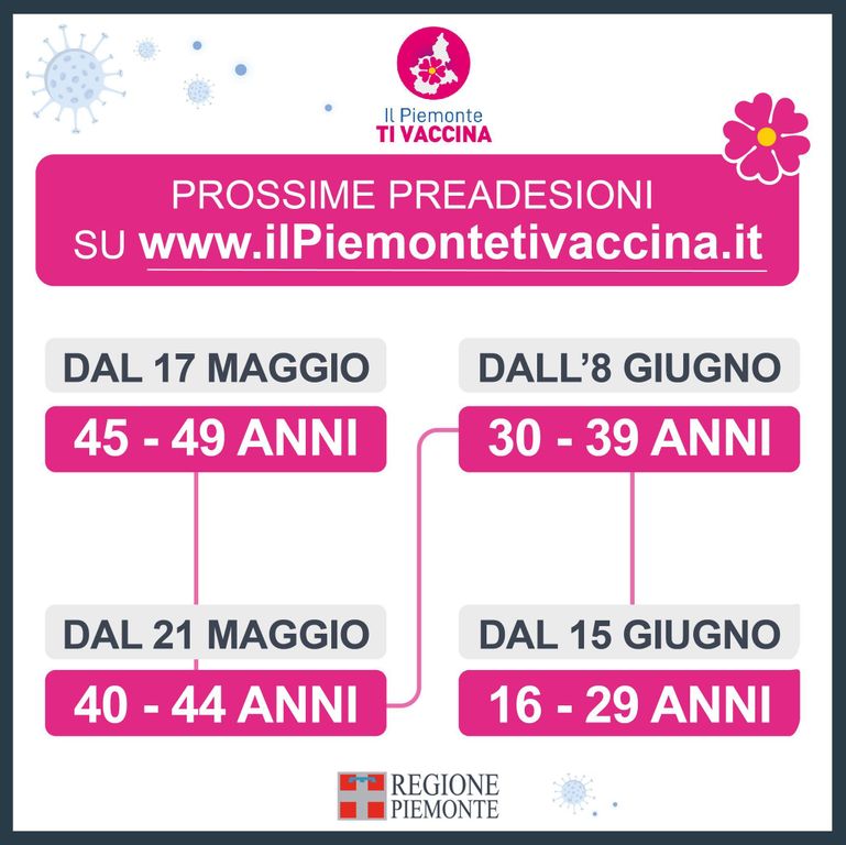 Da lunedì 17 maggio potrà aderire sul portale www.IlPiemontetivaccina.it la fascia 45-49 anni e da venerdì 21 maggio la fascia 40-44 anni.