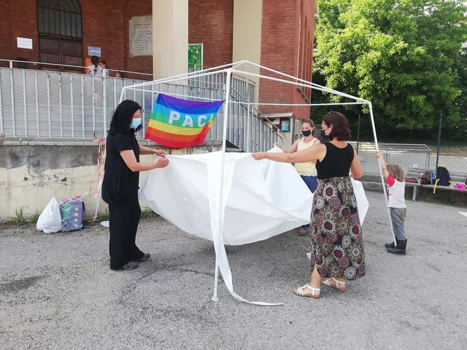 A seguito della regolare richiesta di proroga del permesso di occupazione suolo pubblico presentata venerdi presso gli uffici comunali, genitori e abitanti di Serravalle hanno allestito nuovamente i gazebo per ospitare l'assemblea quotidiana.