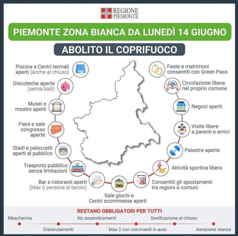 Una ‘quasi normalità’, pertanto, che come ha ricordato venerdì il presidente Cirio annunciando il passaggio di colore “Non vuol dire che non dobbiamo più stare attenti. Per vivere questa libertà e poterne godere appieno abbiamo il dovere di continuare a essere prudenti. Indossiamo la mascherina, evitiamo gli assembramenti e viviamo questo momento con grande senso di responsabilità”.